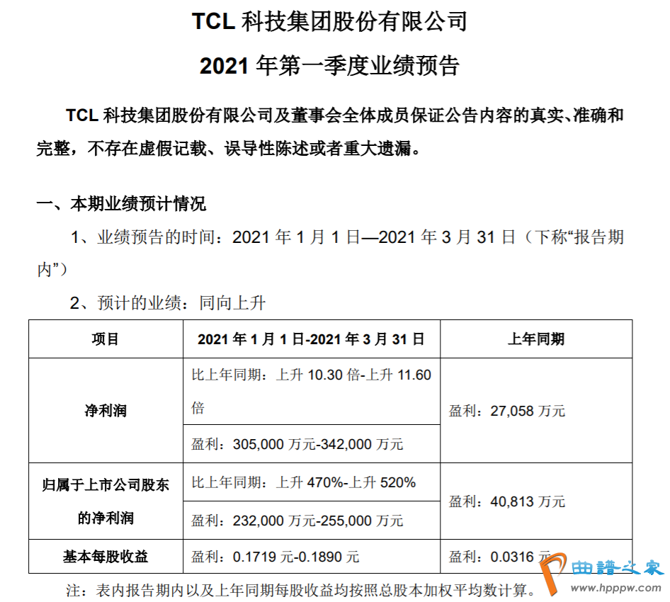 4月12日晚,TCL科技公告,公司预计2021年第一季度实现归属于上市公司股东的净利润为23.2亿元–25.5亿元,同比上升470%-上升520%。