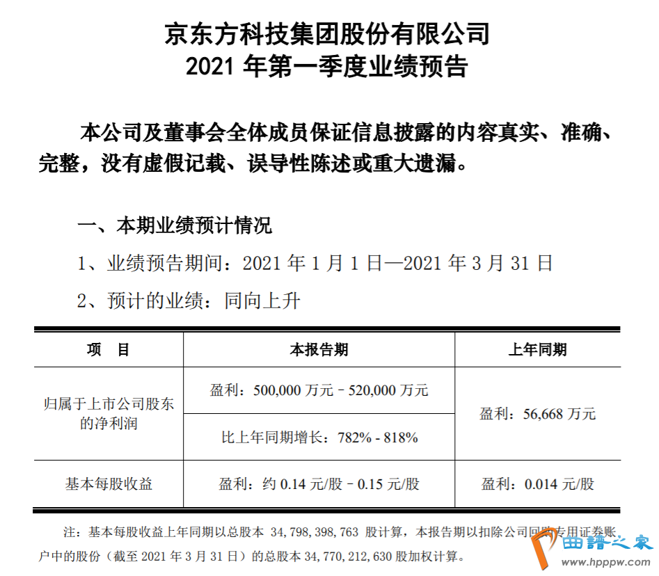 4月12日晚,京东方A公告,预计公司第一季度归属于上市公司股东的净利润为50亿-52亿元,同比增长782%-818%。