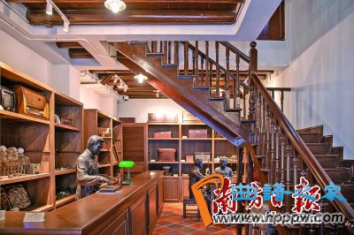 沿着狭窄的木质楼梯往下,二楼洽谈室内,拿烟斗的塑像是陈彭年,他在跟交通员商量工作。屋子布置得很豪华,高档的桑枝桌椅中间放着桑枝圆桌,上面放着潮汕工夫茶具和德国造的“竹坚笼”汽油灯。房间两边放着高脚桑枝椅和高脚茶几,托着高雅的烟灰缸和棋盘。