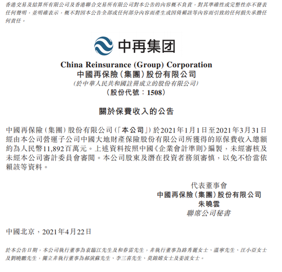 4月22日消息,中国再保险发布公告,公司于2021年1月1日至3月31日经由公司营运子公司中国大地财产保险股份有限公司所获得的原保费收入总额约为人民币118.92亿元。