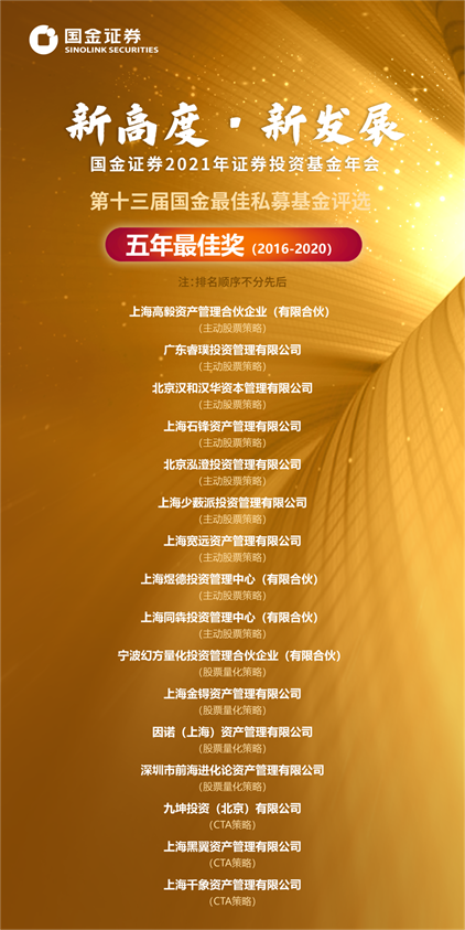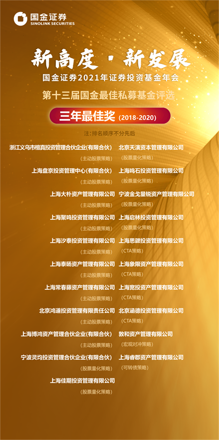 据悉,“国金证券最佳私募证券投资基金评选”举办至今已有十三个年头,评选旨服务综合资产管理领域、挖掘行业精英、助推资产管理行业发展。本届评选以2020年底为截止时间,从一至三年内(满一年但不满三年)、2018-2020三年、2016-2020五年、2011-2020十年等几个重要的时间考核区间出发,在甄别不同投资策略、区分不同规模的基础上,评选出综合能力突出的私募证券投资基金管理人。