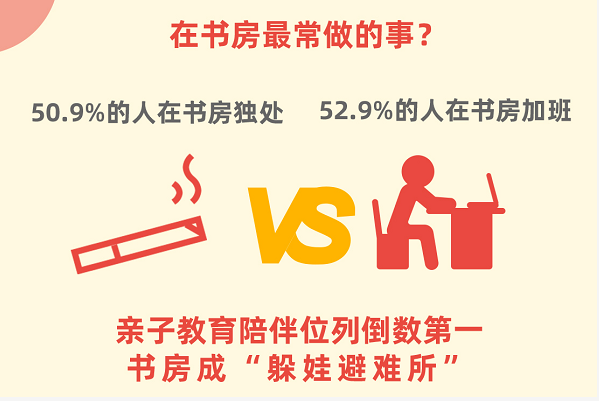 书房的功能和价值也愈发多样化。调研显示,在书房用途功能上,除了阅读,书房也被人们用于工作加班、独处、看影视、会客聊天、和健身锻炼等。高达52.9%的人把书房作为加班工作的场所,50.9%的人更愿意在书房独处“静静”。在书房陪孩子阅读、玩耍的比例倒数第一,多数人把书房作为暂避小憩的场所。