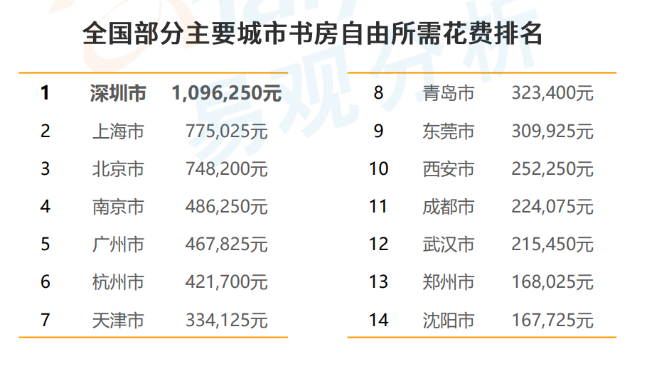 房价高启的当下,书房的诗意难抵现实。有书房的家庭中,6成以上的房屋面积都在120平米以上,从户型上来看,有书房的家庭住房都是3居室及以上的户型。报告调研了各地书房的花费成本,显示全国实现“书房自由”的平均成本为29万元。而在具体城市方面,深圳、上海、北京的书房成本位列前三甲,分别高达近110万元、78万元、75万元。书房自由很远,但读书自由很近。报告显示,各城市年均购书花费从500元到800元不等,相对于让人望而却步的书房自由,大部分年轻人都能轻松实现读书自由的梦想。