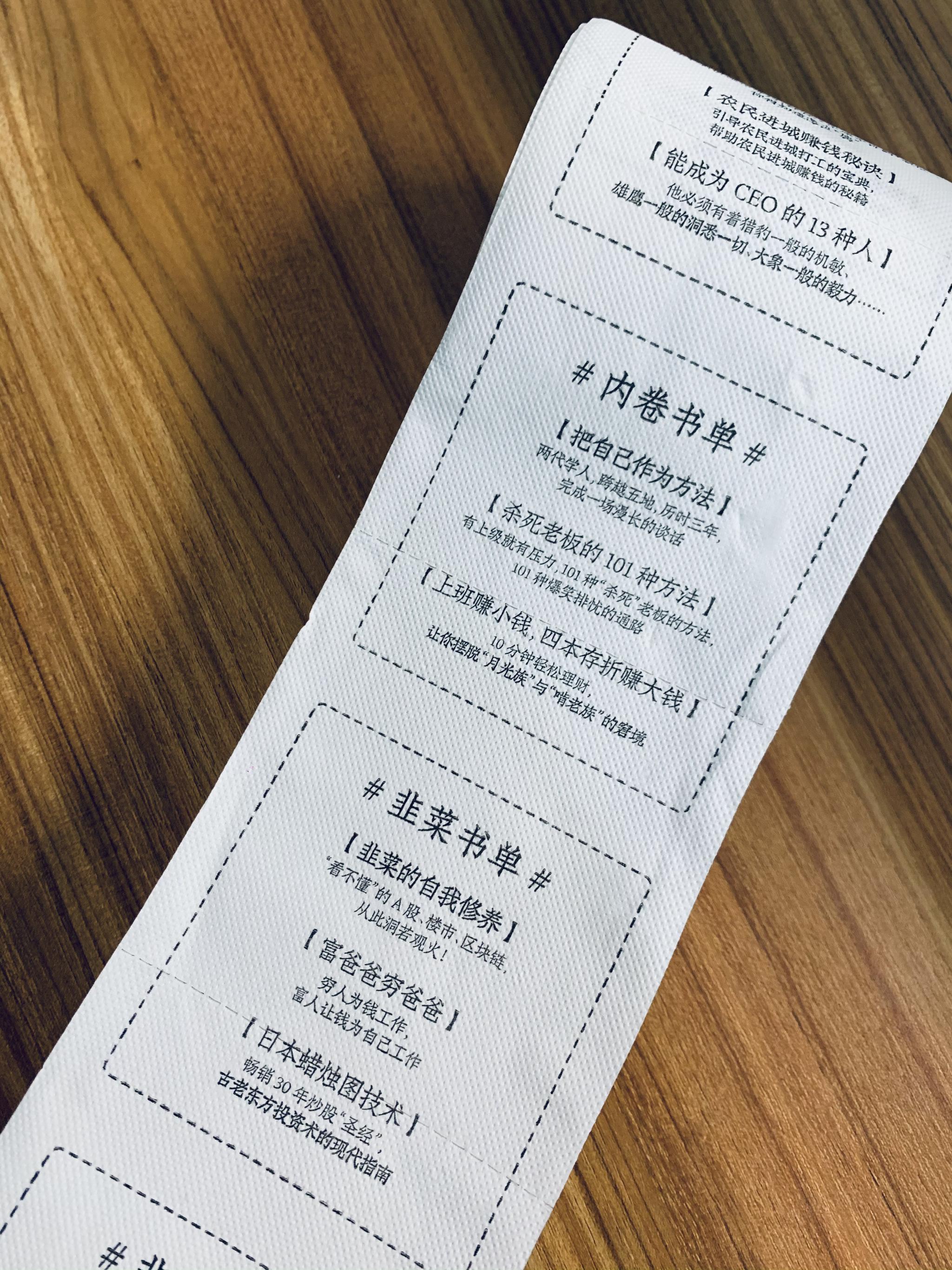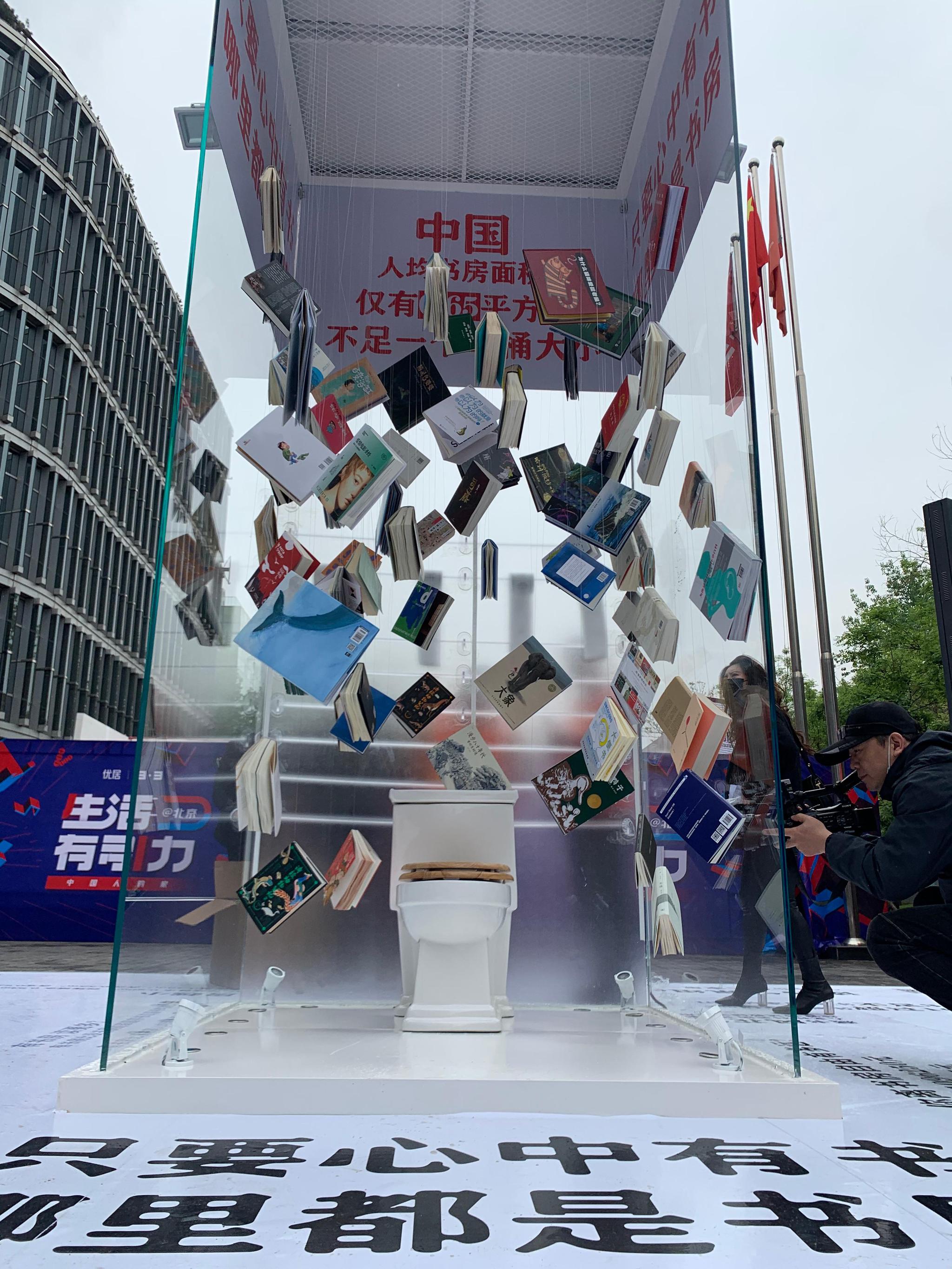 “厕所”所处的地帖上,印有许多关于书房面积与阅读现状的观点。这间透明的“厕所”内部带有马桶,悬挂各式各样图书,“厕所”外侧挂满印着作家金句和趣味书单的卷纸,过往行人可以自行取拿,把有“文化味”的厕纸带回家。这间“厕所”是当当在世界读书日期间设计的创意装置,希望以此来唤起公众对于阅读现状的关注。