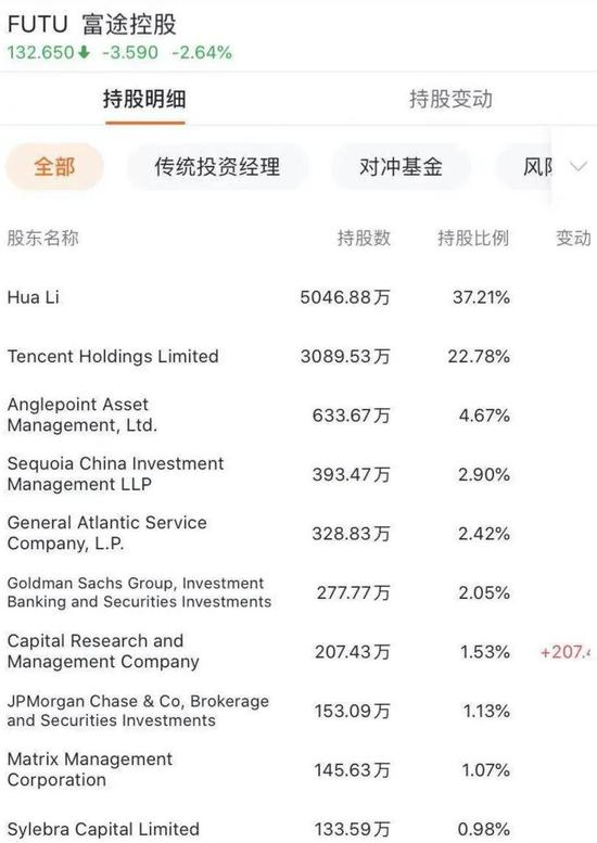 在富途的前十大股东名单中,除创始人李华、曾连续数轮领投的腾讯持股比例分别为37.21%和22.78%外,其余股东的持股比例均低于5%;同时包括红杉资本(Sequoia China)、美国泛投资(General Atlantic)、高盛、Capital Research、JP摩根等在内的国内外知名投资机构也名列富途的前十股东名单。