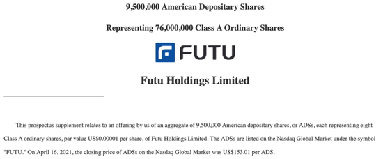 根据前一天的公告,富途计划定向发行950万股ADS(每份代表8股A类普通股)。富途还表示,将授予此次ADS发行的承销商30天的选择权,以额外购买至多142.5万股ADS(“超额配售选择权”,即绿鞋)。
