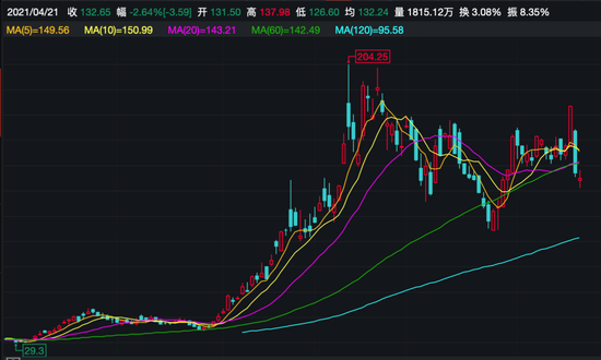 而从去年年底到今年2月,富途股价一路节节攀升,从2020年12月31日收盘价45.75美元,一度在2021年2月10日最高触及204.25美元的高点,涨幅达到346.45%。此后虽受中概股集体回调影响,股价也始终在140美元附近震荡。