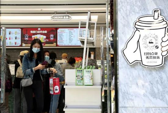 2020年10月8日,游人从上海豫园一家饮品店走出。新华社图