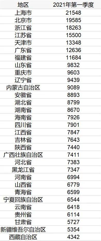 上海一季度居民人均可支配收入达到21548元,是唯一一个超过2万元的省份。由于上海拥有大量的跨国企业以及上交所等金融机构,总部经济、研发创新等十分突出,进而吸引了大量人才,这些群体的收入都较高。