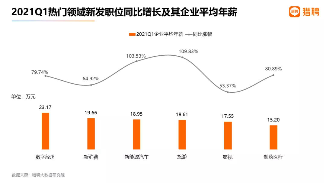 从领域上看,2021年一季度的六大热门领域分别为:新能源汽车、旅游、影视、制药医疗、新消费、数字经济,各领域一季度的新发职位增长大体呈井喷趋势,新发职位同比增长均超50%。