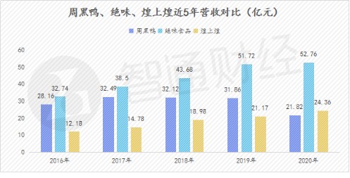 整个2020年,受到公共卫生事件冲击,周黑鸭的产品销量由2019年的35854吨下降至25812吨;营收由2019年的31.86亿元(人民币,下同),下降至21.82亿元。