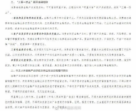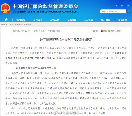 4月22日,银保监会发布关于#警惕明星代言金融产品风险#的提示,提醒金融消费者要理性看待明星代言,做到“三看一防止”,切实防范金融陷阱。银保监会称,近年来,随着网络技术的迅猛发展,各类互联网平台及理财投资产品层出不穷,一些机构邀请明星代言推广或站台,存在过度宣传、承诺高额回报、误导性宣传等问题,严重损害了金融消费者合法权益。因此消费者选择金融产品或服务时,不可盲信明星代言,一看机构是否取得相应资质;二看产品是否符合自身需求和风险承受能力;三看收益是否合理;四要防止过度借贷。