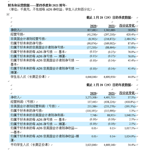 - 2021财年季度平均学生人次(长期正价课)从上年的约3,023,840增长到约4,669,140,同比增长4%。