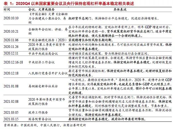 货币政策强调稳定宏观杠杆率。在就业、经济、通胀和国际收支压力可控的背景下,我们早在2020年Q4就判断今年央行货币政策最终目标切换至金融稳定,从中央经济工作会、政府工作报告及近期国常会表态来看,“保持货币供应量和社会融资规模增速同名义经济增速基本匹配,保持宏观杠杆率基本稳定”是核心政策要求,为保持宏观杠杆率稳定,央行将采取紧信用方式,在经济基本面趋稳的背景下,这意味着央行信贷、社融等实体部门负债端数据将经历压降的过程,我们预计2021年社融新增约31万亿,较2020年回落4万亿左右,增速降至10.9%,其中信贷新增量由去年的19.6万亿回落至约19万亿,增速降至11%,M2增速回落至9%,低于GDP+CPI,流动性冗余有明显收敛。