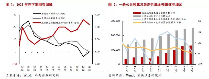 财政子弹“充裕”,不急转弯保持支出强度。2020年财政下半年呈现出显著的“增收节支”特征,我们在1月28日的《财政收官有余力,资金结余腾空间》中提示,根据2020年财政数据,一般公共预算及政府性基金预算的超收节支规模超过2.5万亿元,在此基础上2021年财政安排的新增资金规模不小,财政子弹充裕,可以有效支持经济发展。2021年赤字率、赤字总额、新增专项债规模环比有所下调,但仍显著高于2019年,财政预算收入、土地出让收入、政府性基金支出也积极增长,可以有较为充裕的资金空间,在支持经济发展的同时,预留政策空间并防范存量风险,前者体现大国博弈背景下政策的跨周期调节,后者指向防范系统性风险,地方政府隐性债务问题是潜在风险点,作为“历史包袱”的存量债务风险尤为引人关注。