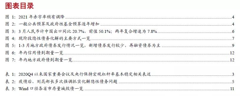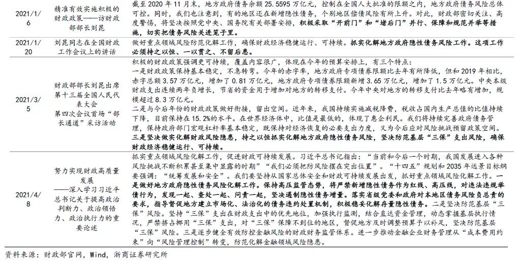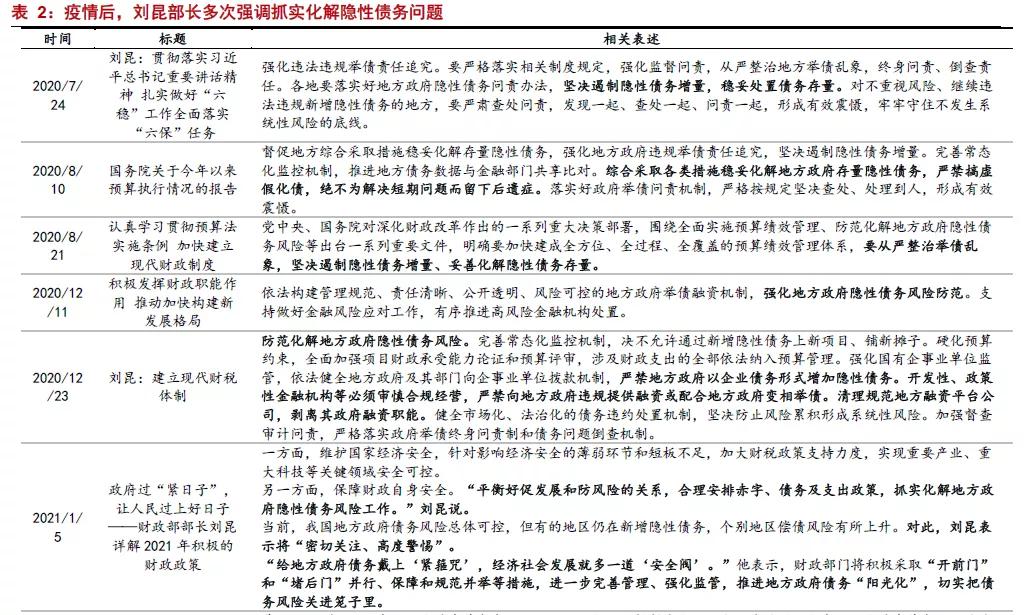 抓实化解地方政府隐性债务风险。2020年下半年后,在支持经济发展和预留政策空间之外,化解债务风险逐步成为财政的重点工作,在重要会议及官员表态中均有体现。2020年7月起,刘昆部长先后多次要求“坚决遏制隐性债务增量,稳妥处置债务存量;抓实化解地方政府隐性债务风险工作”。中央经济工作会、政府工作报告等也先后表态要“抓实化解地方政府隐性债务风险工作”和“稳妥化解地方政府债务风险,及时处置一批重大金融风险隐患”。此外,4月8日,财政部长刘昆在《努力实现财政高质量发展》一文中明确表示抓实重点领域风险化解工作,促进财政可持续发展,一是将严禁新增隐性债务作为红线、高压线,对违法违规举债行为,发现一起、查处一起、问责一起,坚决遏制隐性债务增量;二是落实省级党委和政府对本地区债务风险负总责的要求,指导督促地方建立市场化、法治化的债务违约处置机制,积极稳妥化解存量隐性债务。