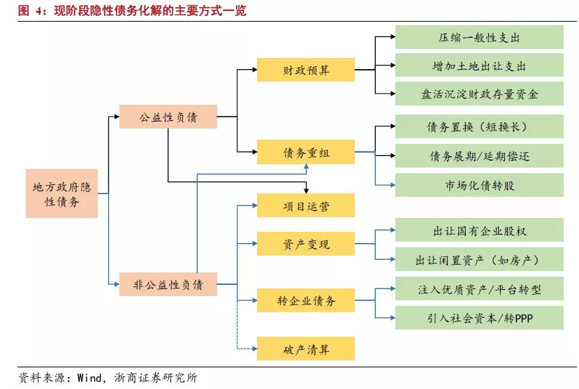 其三是转化为企业债务,将隐性债务转为企业经营性债务,将城投平台和政府进行切割,将具备较好现金流的收益性项目划转至融资平台,剥离政府债务促使平台转型成为一般企业,将隐性债务转化为企业债务,由企业经营予以偿还,山西、湖北、贵州等地有具体应用。