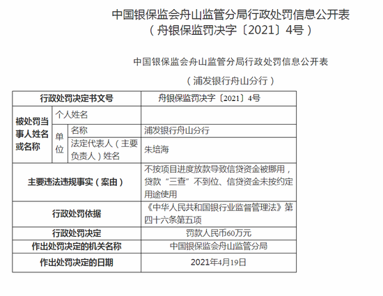 本网讯_:浦发银行舟山分行被罚60万:不按项目进度放款导致信贷资金被挪用