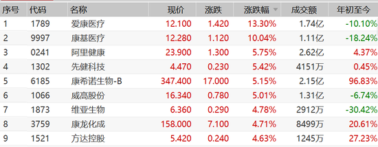 医药股集体爆发,大涨13%,涨超10%,阿里健康、先建科技、康希诺等涨超5%。