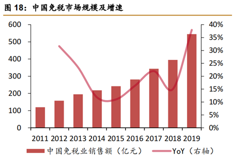 2011-2019年中国免税业销售规模的从120亿元增长至545亿元,2019年同比增速高达38%;2011年-2019年中国免税业年均复合增长率为20.8%,高于全球免税销售额7.5%的年复合增速。