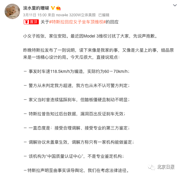 其实,对于这份数据,当事车主张女士曾在个人微博上发文予以否认及质疑。张女士称,事发时车速118.5km/h 不实,实际约为60-70km/h,并称警方从未判定事发时其车辆超速。
