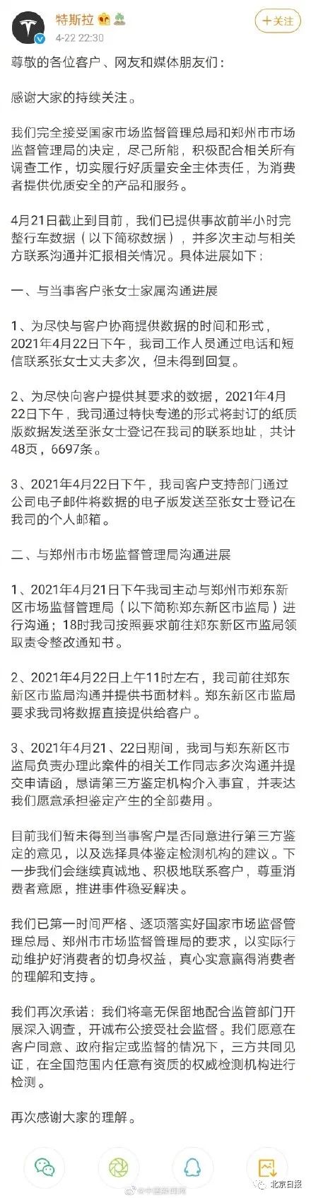 当天深夜,特斯拉再发声,披露与当事客户及郑州市市场监督管理局沟通进展。