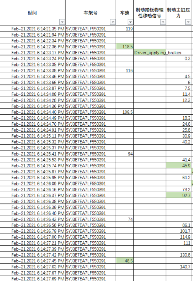 在驾驶员最后一次踩下制动踏板时,数据显示,车辆时速为118.5千米每小时。在驾驶员踩下制动踏板后的2.7秒内,最大制动主缸压力仅为45.9bar,之后驾驶员加大踩下制动踏板的幅度,制动主缸压力达到了92.7bar,紧接着前撞预警及自动紧急制动功能启动(最大制动主缸压力达到了140.7bar)并发挥了作用,减轻了碰撞的幅度,ABS作用之后的1.8秒,系统记录了碰撞的发生。驾驶员踩下制动踏板后,车速持续降低,发生碰撞前,车速降低至48.5千米每小时。