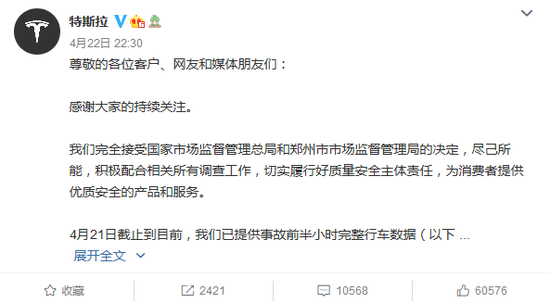 4月22日深夜,特斯拉官方再度通过微博公布事件最新进展,称当天多次通过电话短信联系当事车主丈夫,但未获答复;其后特斯拉分别将纸质数据和电子数据通过快递和邮件发送至车主联系地址。