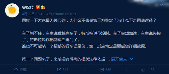 4月22日晚,微博名为@安保佳 的维权车主就此发布长微博称,虽然特斯迫于监管部门压力给出了数据,但当下检测机构的能力跟不上技术,新能源汽车控制器软件检测尚无相关标准,很难得出合理的鉴定结果。