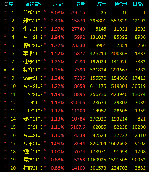 4月23日,国内期市早盘多数品种飘红,涨逾2%,生猪、豆一涨近2%,冲高回落。