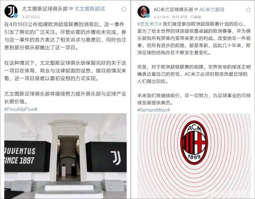 而AC米兰和尤文图斯则发表退出声明,但言辞含混,态度不明。AC米兰称“俱乐部必须对那些热爱足球的人们做出回应”;尤文图斯则表示“这一项目很难以最初设想的方式实现。”