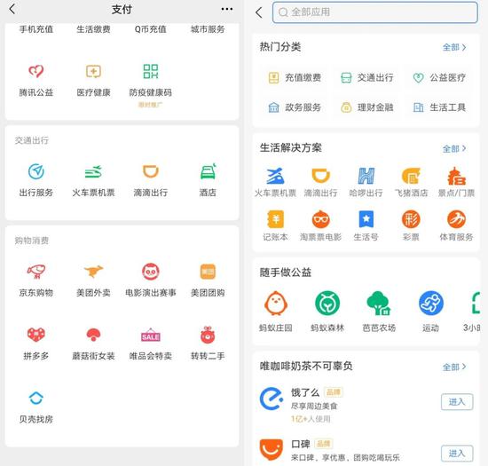 微信第三方平台页面(左)和支付宝第三方平台页面(右)