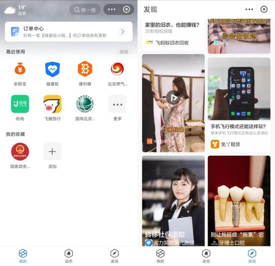 例如,它在“我的小程序”底部导航栏加入“发现” 按钮,子页面设有话题专区,并以双列瀑布流展示小程序商家的短视频和图文内容。