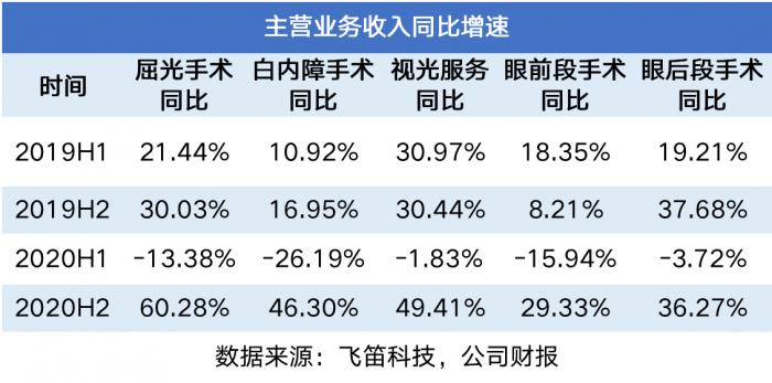 由于爱尔眼科半年报、年报才公布分业务收入情况,为了更直观看下半年各大业务的愎复情况,我们将数据全部折算成半年度数据。由上图可知,上半年,疫情影响下五大业务收入均出现负增长,下半年恢复较好,增速均超过2019年同期水平。