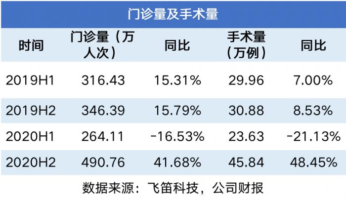 爱尔眼科的营收增速反弹,主要体现在门诊量和手术量数量的快速增长上。2020年下半年,爱尔眼科的门诊量和手术量增速分别为41.68%和48.45%,较2019年同期增长非常明显,主要原因是下半年眼科消费需求的释放。