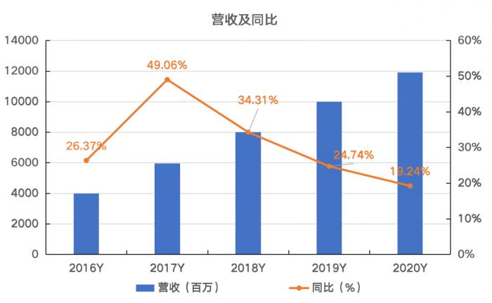 分季度看,疫情影响下,2020年一季度,公司的营收增速出现负增长,二季度转正,但增速不到1%。到了三、四季度,营收增速恢复好且高于2019年同期水平。