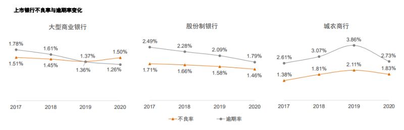 截至2020年末,上述38家上市银行不良贷款余额1.7万亿元,较2019年末增加15.37%;不良率微升0.04个百分点至1.51%。不良额与不良率“双升”,逾期率有所回落,下降0.20个百分点至1.49%。