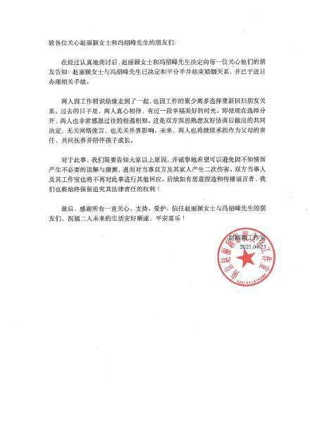 4月23日上午,赵丽颖工作室发布微博宣布赵丽颖与冯绍峰已结束婚姻关系,“因工作聚少离多选择重新回归朋友关系”,未来将共同抚养并陪伴孩子成长。