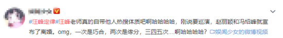 同时,话题#汪峰定律#也冲上热搜,原来歌手汪峰老师刚宣布巡演的消息不久,赵丽颖冯绍峰就宣布了离婚。网友纷纷调侃,“你可以不相信爱情,但你不可以不相信汪峰”。