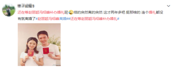消息传出后,#赵丽颖冯绍峰离婚#迅速引爆热搜,网友纷纷议论表示太突然,“还在等冯绍峰补办给赵丽颖的婚礼呢,这就离婚了”。