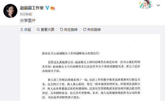 据凤凰网娱乐,赵丽颖方回应表示“这是丽颖峰哥友好协商后的共同决定,我们尊重他们的决定,之后两人会继续承担作为父母的责任。”