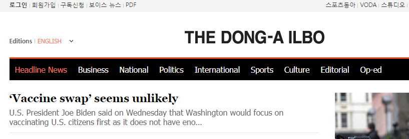 “拜登称美国疫苗不足被指间接拒绝韩疫苗援助请求”——韩国《东亚日报》23日头条以此为题解读称。