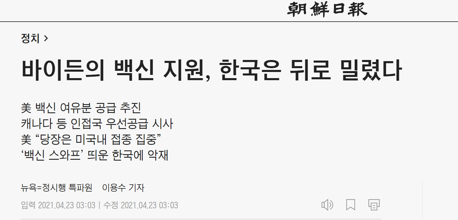 《朝鲜日报》:拜登的疫苗援助(对象),韩国被推后了