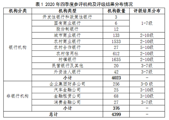 4399家参评机构中包含大型银行24家、中小银行3999家、非银行机构376家,结果分布见表1。