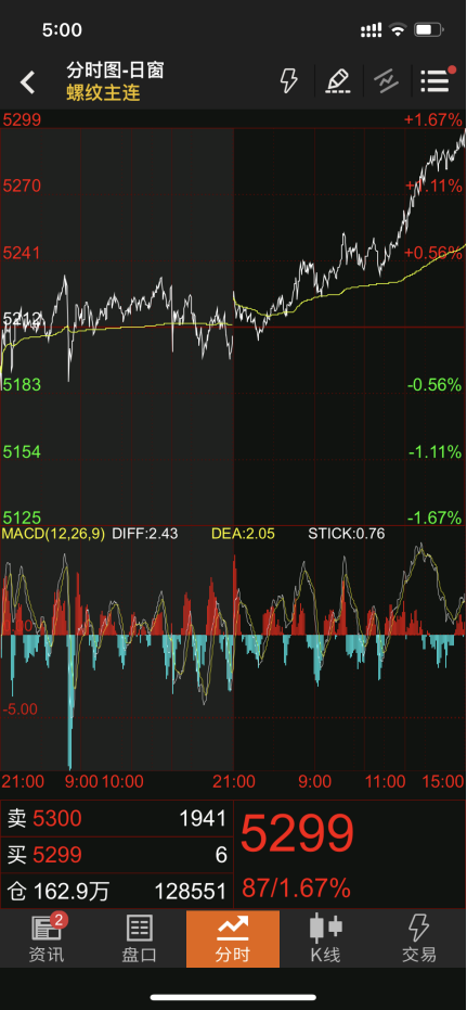 4月23日,主力合约盘中一路突、突向上,最高抵达5300元/吨,涨幅1.67%,创历史新高。若不是到了收盘时间,看趋势还要继续向上。
