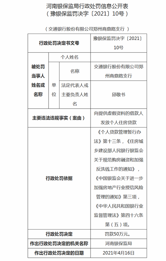 4月9日消息,河南银保监局行政处罚信息公开表显示,股份有限公司郑州商鼎路支行因向提供虚假资料借款人发放个人住房贷款,被处罚款50万元。