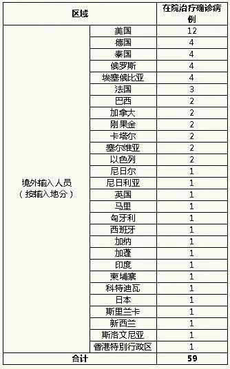 截至2021年4月22日24时,累计境外输入性确诊病例1584例,出院1525例,在院治疗59例。现有待排查的疑似病例2例。
