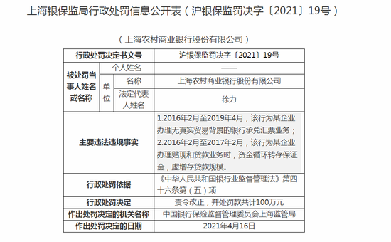 上海农商行被罚100万:办理无真实贸易背景银行承兑汇票业务