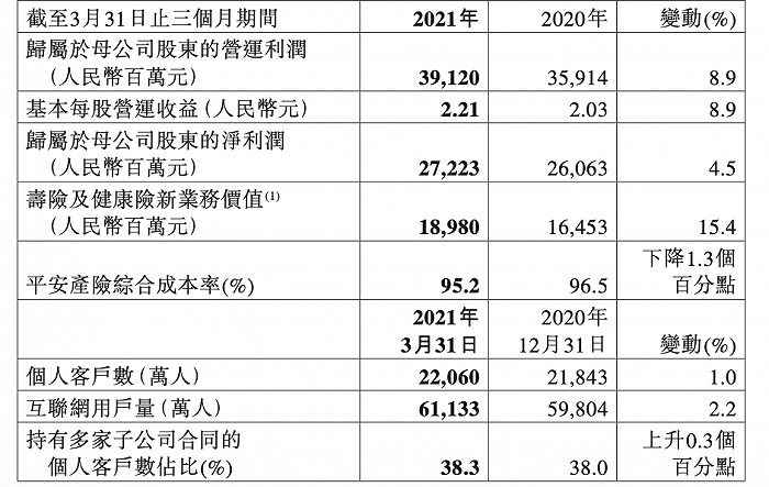 报告显示,第一季度,平安归属于母公司股东的净利润272.23亿元,同比增长4.5%;归属于母公司股东的营运利润同比增长8.9%至391.20亿元;年化营运ROE为20.0%。