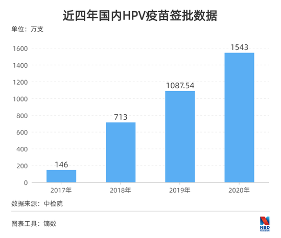 中检院批签发数据显示,2019年到2020年间,HPV疫苗在中国市场迎来增长大年。从HPV疫苗获批进入国内市场至2020年末,国内HPV疫苗的累计批签发总量约3489万支。